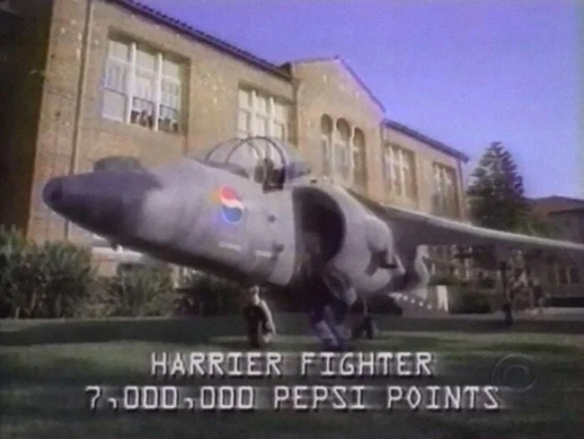 В 1996 году Pepsi провела рекламную акцию, в рамках которой вы могли набирать баллы, покупая продукты Pepsi. Чем больше баллов вы набираете, тем больше призов вы можете получить. Среди призов были футболки, бесплатная Pepsi, солнцезащитные очки и т. Д. У них также был рекламный ролик, в котором они рекламировали самолет Harrier за 7 миллионов баллов. Один парень прочитал правила акции и обнаружил, что вы имеете право купить баллы по 10 центов. Это означало, что для получения 7 миллионов баллов вам придется заплатить $700 000. Стоимость Harrier в то время составляла около $20 миллионов. Gарень собрал деньги, купил баллы и потребовал самолет. Когда Pepsi отказалась, он подал на них в суд. Он проиграл, но это была хорошая попытка.