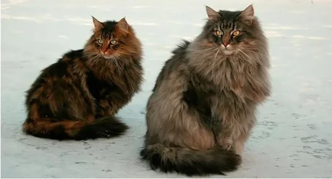 Зимний гардероб. Несмотря на разнообразие окрасов норвежской лесной кошки, существующих в рамках породы, все норвежские лесные кошки могут похвастаться богатой зимней «одежкой». Это основная шерсть с густым подшерстком и длинные покровные волосы вдоль хребта и на хвосте. Волосы обладают водоотталкивающим свойством. Длинный хвост доходит до линии плеч, а кисточкой украшены не только уши, но и круглые широкие лапы (между пальцами) — получаются своего рода «шапка» и «ботинки» для кошки. Зная, насколько лютым бывает скандинавский климат зимой, такое убранство не только красиво, но и разумно.