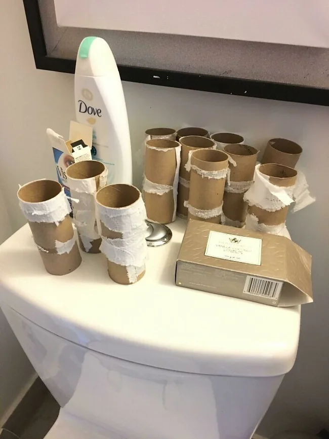 "Мой бойфренд никогда не выбрасывает втулки от туалетной бумаги, вместо этого устраивая из них инсталляцию на крышке бачка"