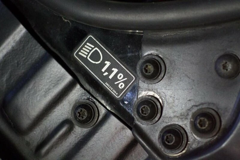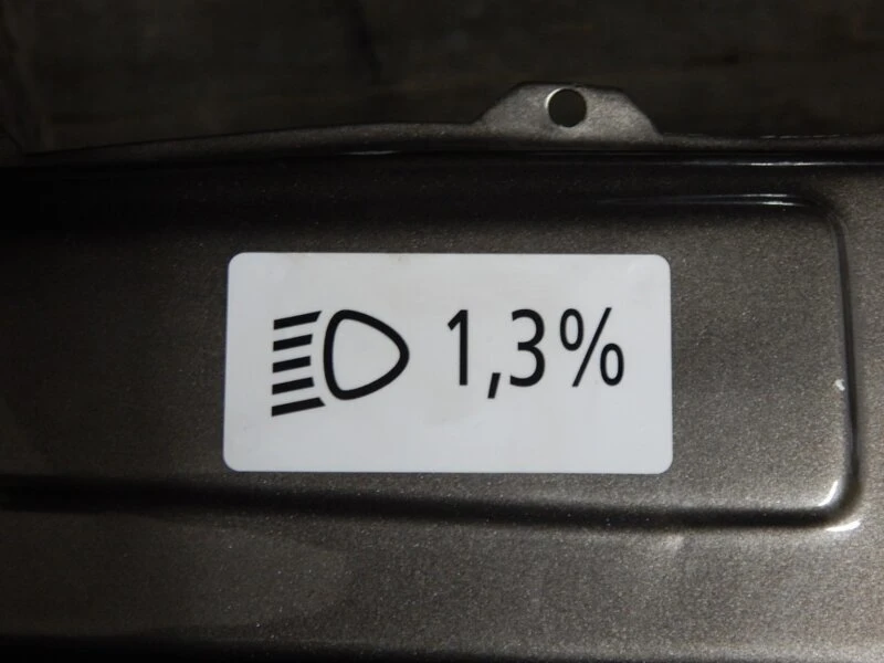 На наклейке с процентами отображен показатель, который указывает, как сильно снижается горизонт светового потока по мере удаления от источника света. К примеру, при показателе в 1,4% на расстоянии 1 метр горизонт света сместится вниз на 14 мм. Если на маркировке значится, 1,3%, то, соответственно, верхняя граница луча света будет опущена на 13 мм в одном метре от приборов.