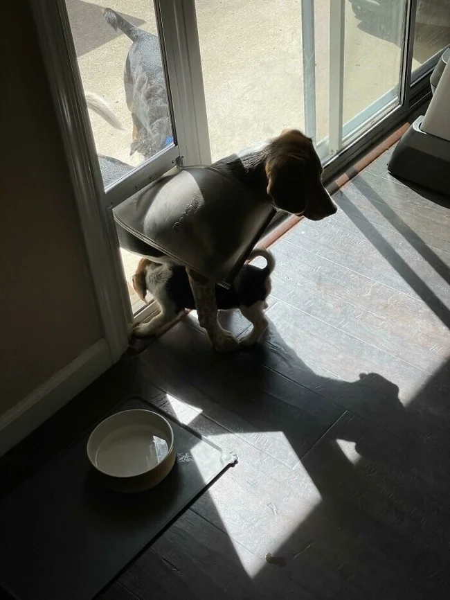 "Брат учит маленькую сестренку пролезать через собачью дверь. Он просто встал в проходе, чтобы показать ей, как это делать"