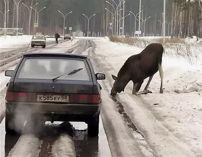 Другой вариант: желание поесть солей. Травоядным животным вечно не хватает кристалликов белой смерти в рационе, вот и приходится извращаться. Они едят водные растения, грызут скальные породы и, конечно, слизывают раскиданные дорожными службами вкусняшки. Риск разбиться велик, но лоси не умеют считать.