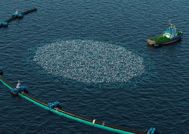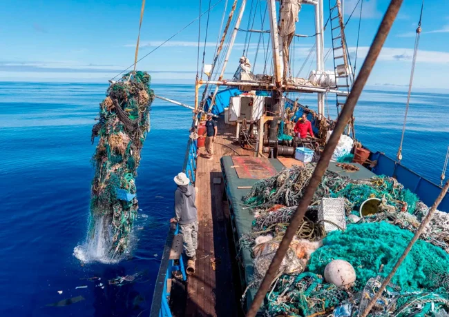 Специальный корабль вылавливает старые сети и другой мусор из океана