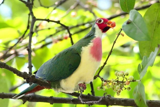Не все голуби - это невзрачные серые птички. В мире есть множество видов голубиных с удивительной окраской, не уступающей оперению попугаев. На фото - розовоголовый пестрый голубь, обитающий в ареале от южной оконечности Таиланда через Малайзию до Борнео и Суматры.