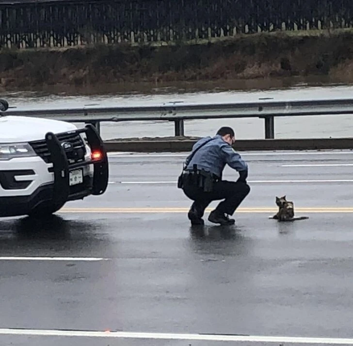 Полицейский остановил движение, чтобы помочь раненой кошке