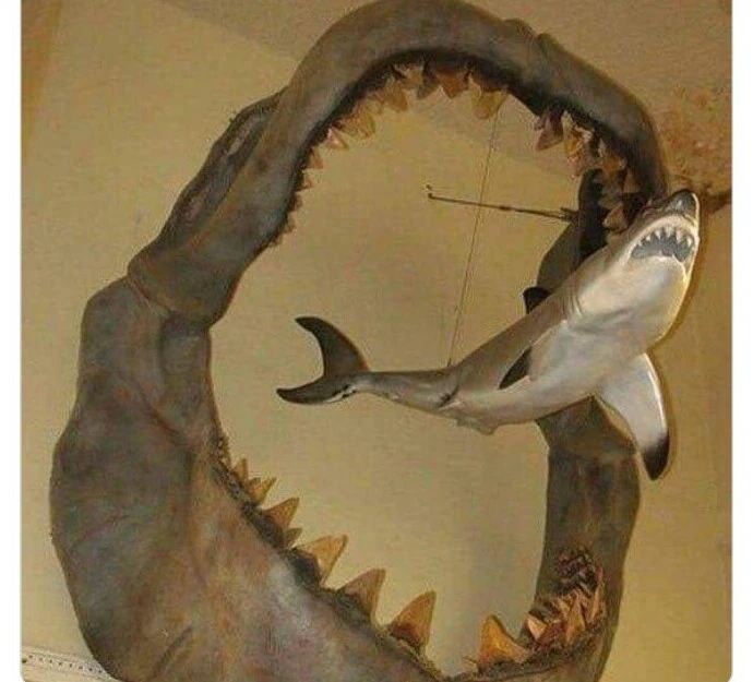 Сравнение челюстей доисторической гигантской акулы-мегалодона, жившей примерно 23 - 3,6 миллиона лет назад, и современной большой белой акулы.