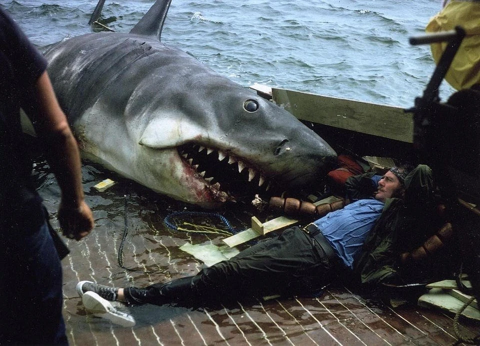 Акула Брюс и Роберт Шоу в перерыве между съёмками «Челюстей»