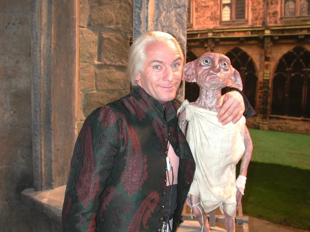 Джейсон Айзекс в образе Люциуса Малфоя с фигуркой Добби