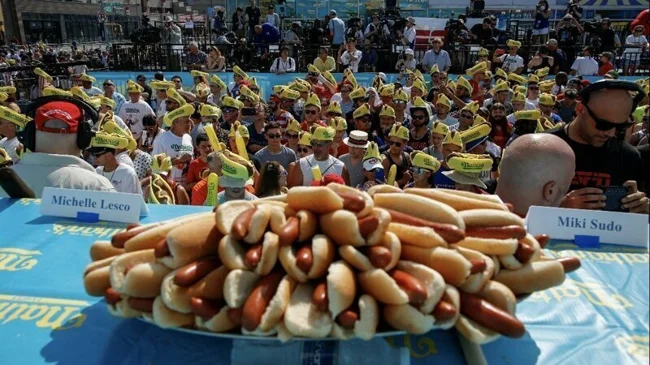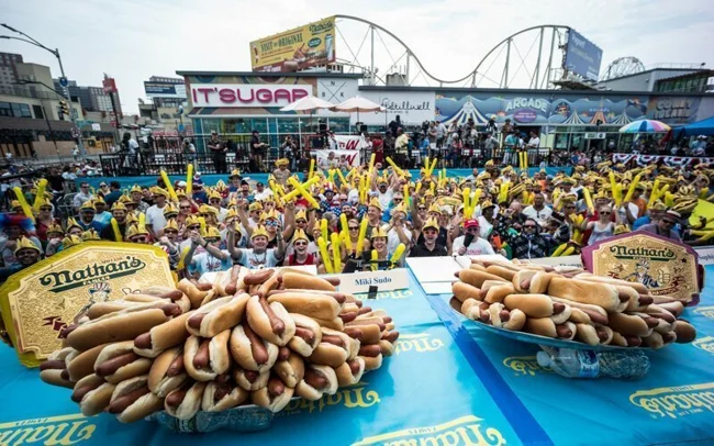 Например, только на День Независимости США (4 июля) съедается 150 миллионов хот-догов. В этот же день на нью-йоркском полуострове кони-Айленд проходит чемпионат по скоростному поеданию хот-догов. В 2011 году Джой Честнат по прозвищу «Челюсти» за минуту умудрился съесть 62 хот-дога. За 8 лет его рекорд еще никто не побил. ![]()