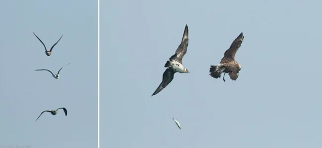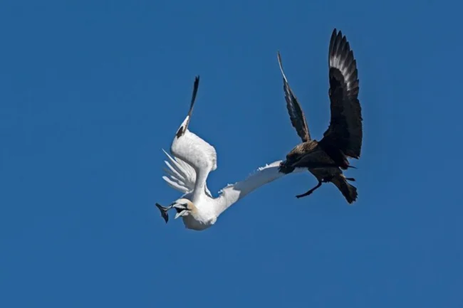 Поморники не желают смерти своим жертвам, ведь мёртвая птица не принесёт тебе новой рыбки. Их задача — заставить бедолагу бросить вкусняшку и поймать её самим. Крачку или тупика они таранят и прижимают к поверхности воды, а вот с олушами такой фокус не проходит. Их приходится запугивать: колоть клювом и выдирать перья до тех пор, пока птица не поймет, что шкура ей дороже и не выпустит добычу. Еда достанется самому быстрому преступнику, совсем необязательно тому, кто прессовал невинную животину. Вкусняшку может получить даже чайка, профессиональная воровка.