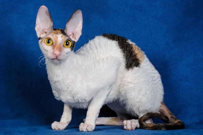 Причиной возникновения его волнистой шерсти была генная мутация. Первое слово в названии породы означает о происхождении в графстве Корнуолл, а второе заимствованно у кроликов. Очень игривые кошки и любят компанию людей. Подходят для людей с аллергией на шерсть.