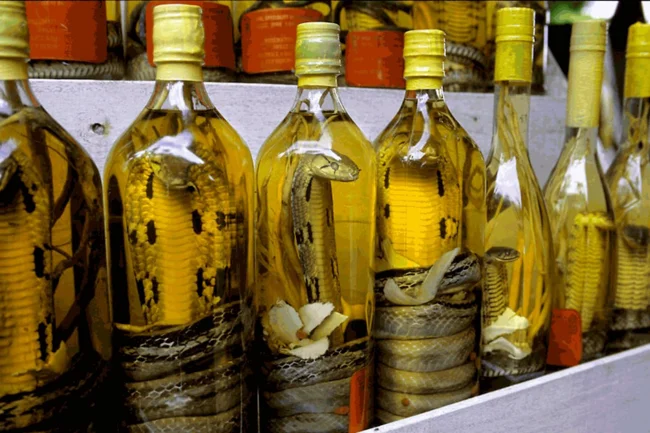 В бутылку с ядовитой змеей заливают рисовое вино … все. Далее это зелье настаивается и в дальнейшем употребляется крайне маленькими порциями в оздоровительных целях. Также бутылку украшают различные коренья, травы, даже скорпионы или птицы.