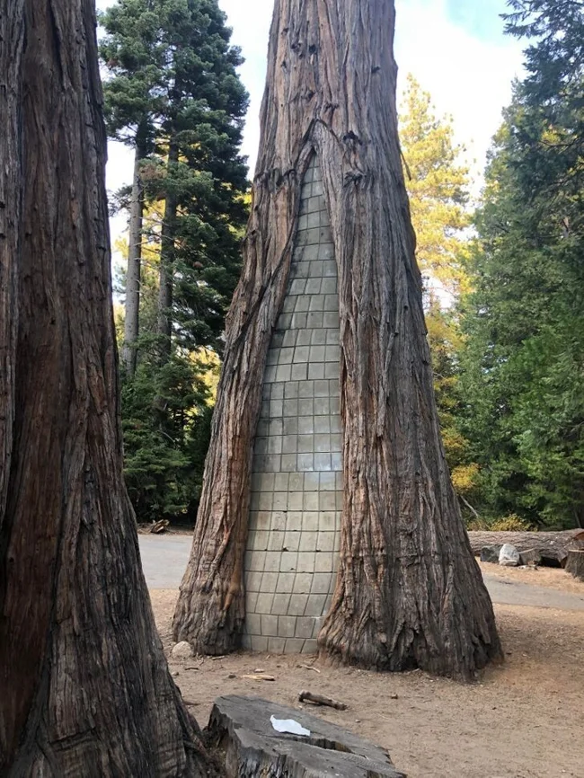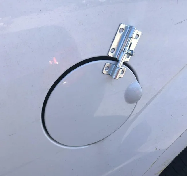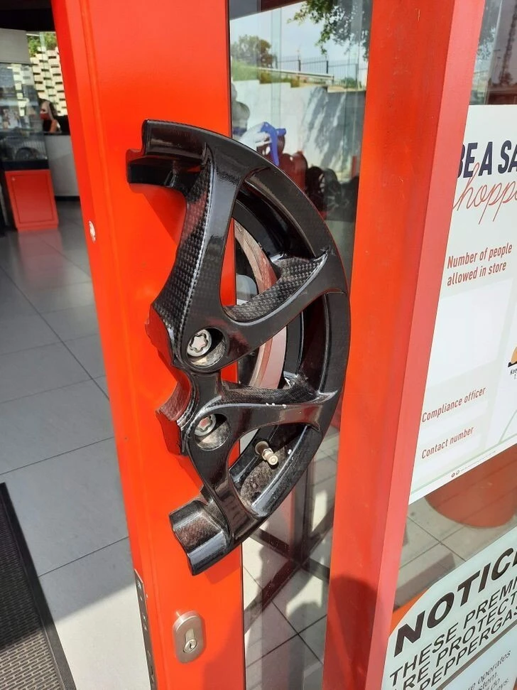 14. "Местная автомастерская использует колесные диски в качестве дверных ручек для своих раздвижных дверей"