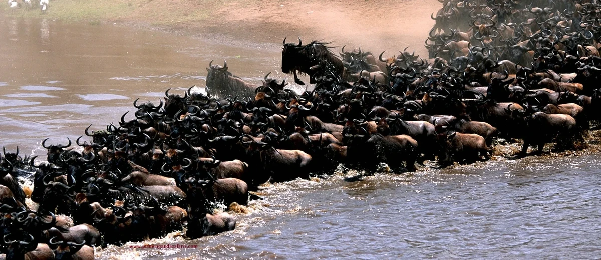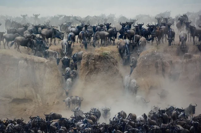 Десятки стад собираются в одно мегастадо. Живой рекой из сотен тысяч животных они гоняют по одним и тем же маршрутам веками. Они неизменно следуют за дождями, чтобы не жевать испепелённое солнцем сено. Ежегодно каждый гну наматывает не менее 1500 км в погоне за едой. Это тоже самое, как сгонять из Москвы в Питер и обратно. Пешком.