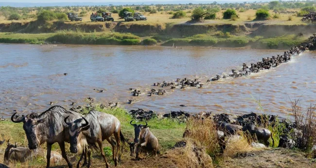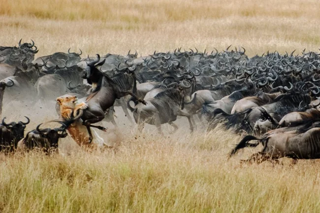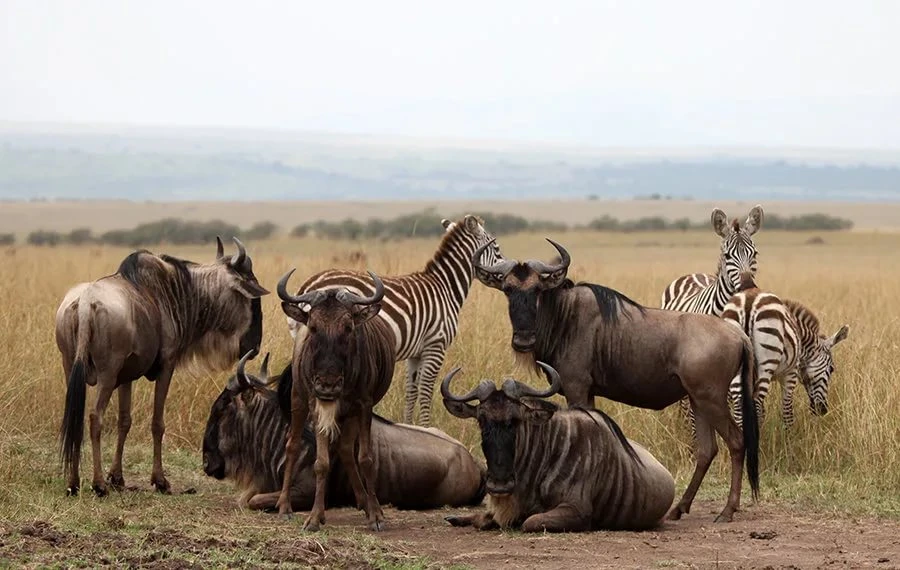 Часто к многочисленным рядам антилоп гну примыкают и другие копытные, например, зебры