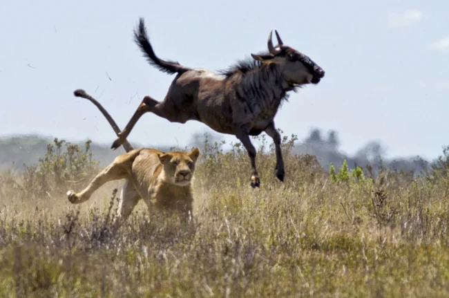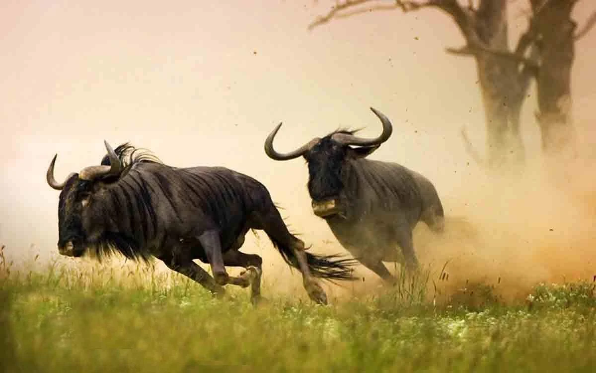 Даже детеныши на пятый день после рождения способны заставить глотать пыль погнавшуюся за ними гиену. А взрослый зверь может бежать со скоростью 55 км/ч на протяжении часа. К тому же характер у голубого гну тот еще: то друг на друга в стаде бычат, то непонятную ученым тарантеллу внезапно отплясывают...