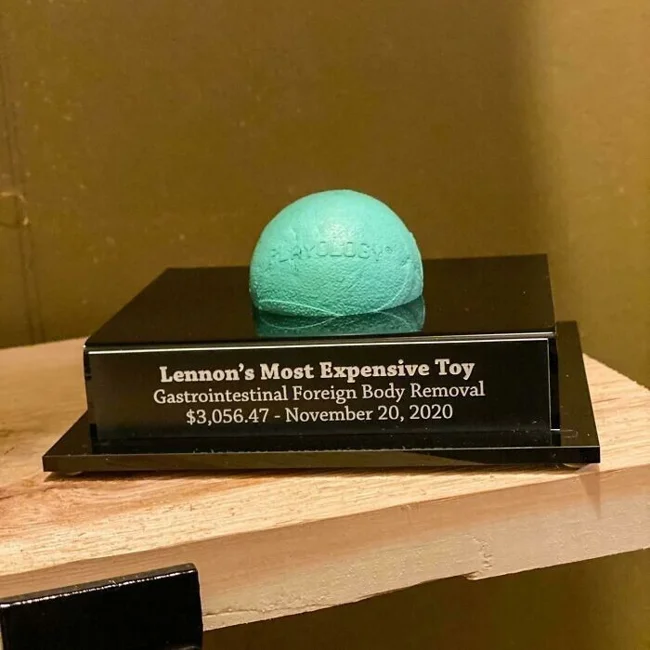 15. "Мой муж сделал специальную подставку для бейсбольного мяча, который врачи достали из желудка нашего пса. "Самая дорогая игрушка Леннона. $3 056, 47"