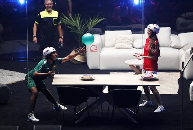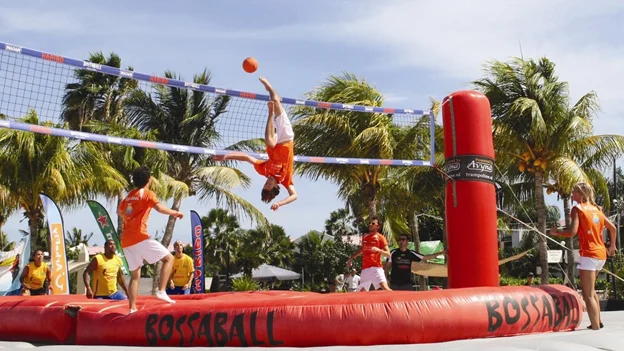 Компиляция футбола, гимнастики и волейбола. Команды должны за 5 касаний перебить мяч за сетку, находясь на огромном надувном батуте с разметкой.