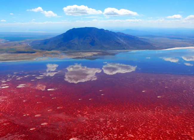 Явление это не постоянное. Происходит только когда вода испаряется и озеро становится максимально насыщенным щелочной солью - любимой средой здешних микроорганизмов.