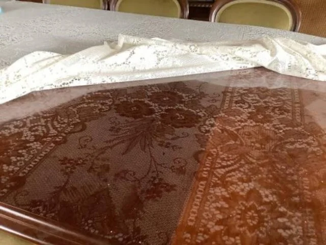 Рисунок скатерти четко отпечатался на поверхности стола... с помощью осевшей пыли