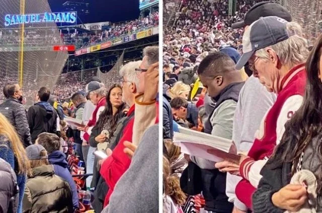 Стивен Кинг читает книгу во время бейсбольного матча с участием команды Red Soх
