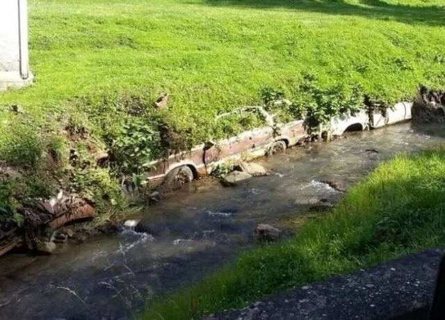 Старые брошенные автомобили сформировали берег реки