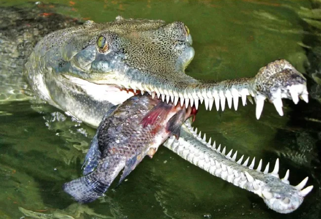 Да, с расплющенной пастью на крупногабаритных животных не поохотишься, зато для рыбы — это смертоносное оружие. Форма зубальника гавиала идеально приспособлена для того, чтобы ловить скользкую и вёрткую добычу. Со своей задачей они справляются настолько хорошо, что рыбаки нередко убивают гавиалов из-за конкуренции!