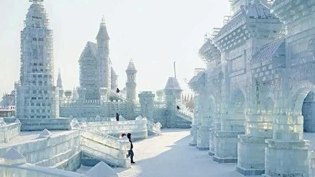 Каждый год в Харбине, Хэйлунцзян, Китай, проходит международный фестиваль ледяных и снежных скульптур, на котором люди строят гигантские ледяные сооружения размером с целый город