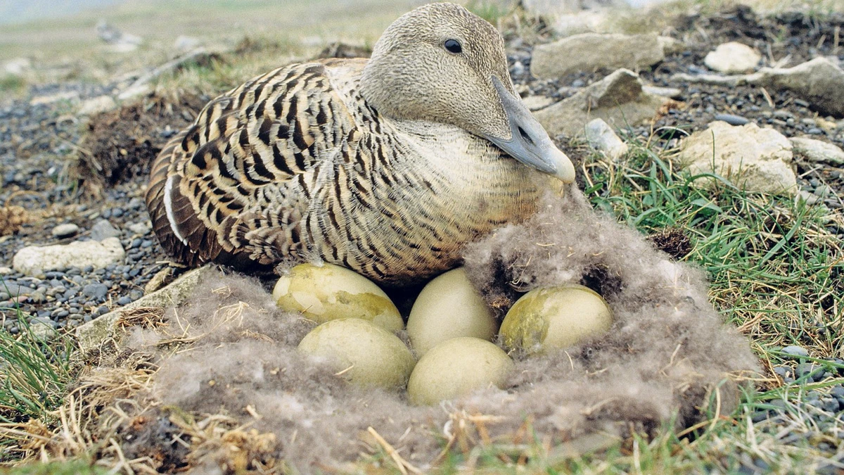 Самка выщипывает пух из груди, чтобы выложить гнездо.