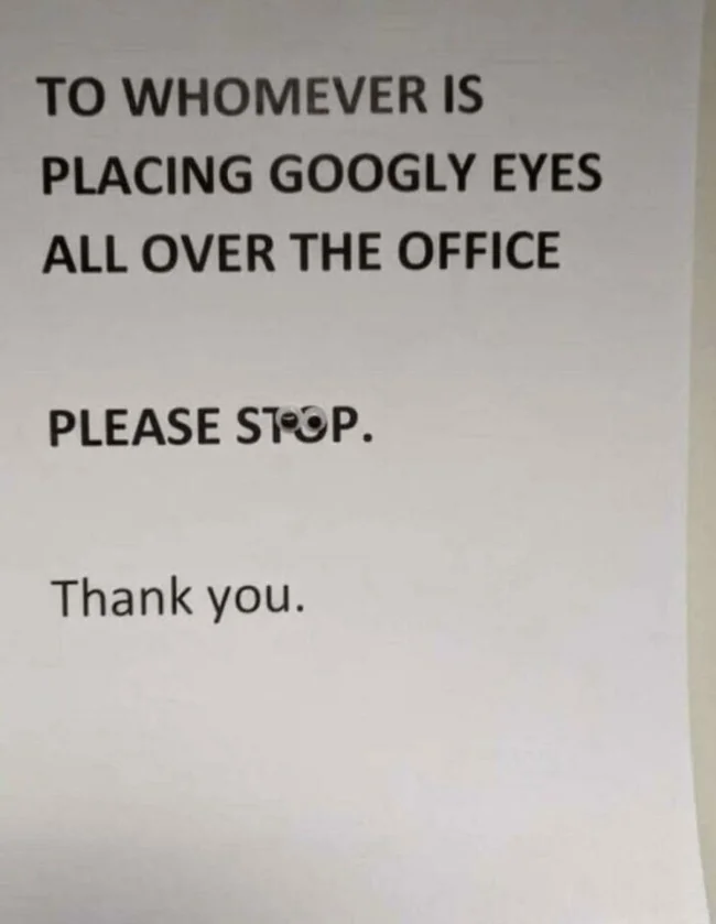 "Тому, кто расклеивает по всему офису игрушечные глазки. Пожалуйста, прекратите".