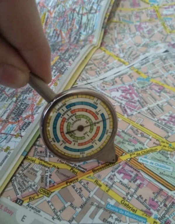 Это курвиметр - прибор для измерения расстояния на карте. Катите его по нужным улицам - и н отсчитывает метры и километры