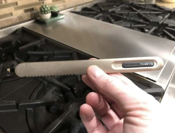 Нож для масла с титановым покрытием и внутренними тепловыми трубками из медного сплава. Он предназначен для того, чтобы его можно было удобно держать в руке горячим и удобно намазывать масло на хлеб