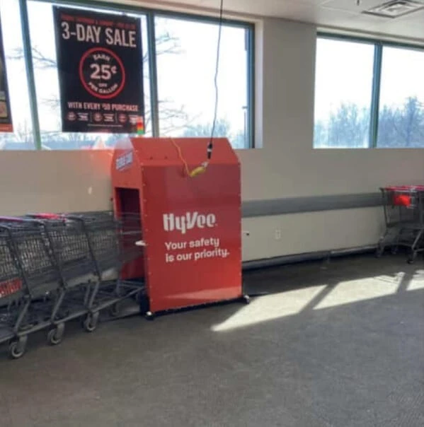 Этот красный ящик - автоматический обеззараживатель магазинных тележек