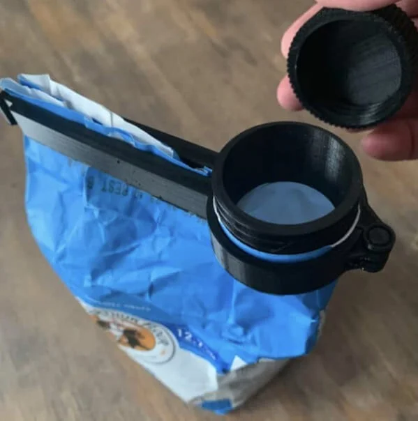 Мой сын-подросток использовал свой новый 3D-принтер, чтобы напечатать мне зажим для пакета с мукой с носиком и завинчивающейся крышкой.