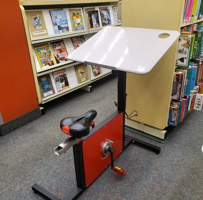 На рабочем столе, в некоторых библиотеках, есть велосипедное сиденье и педали, чтобы вы могли заниматься спортом во время учебы