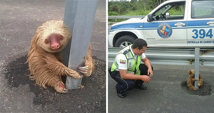 А этого приятеля спасла полиция Эквадора. Он пытался перейти оживленную трассу, но ему было очень страшно