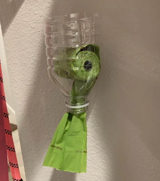 7. Простой самодельный диспенсер для пакетов: обрезанная бутылка на липучке для крепления картин