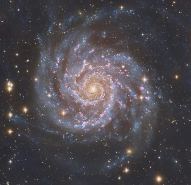 Галактика M74. Галактика повёрнута к нам «лицом», что позволяет астрономам лучше изучить спиральную структуру рукавов.