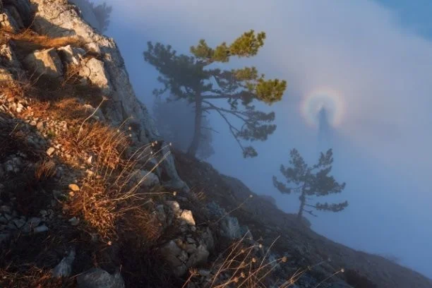 Глория и Брокенский призрак. Глория - радуга, возникающая в противоположном Солнцу направлении на облаках или тумане. А Брокенский призрак - тень от объекта-наблюдателя.
