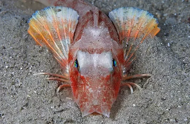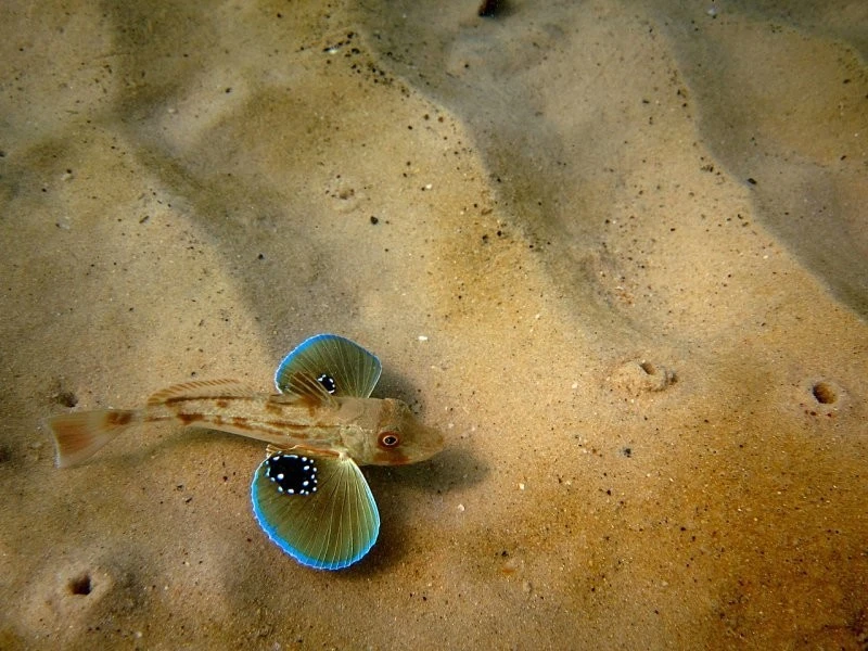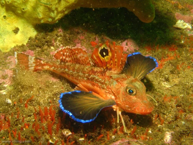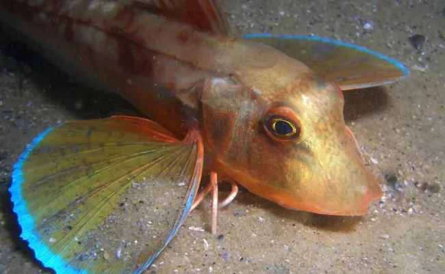 Ножки триглы выглядят так, будто она вероломно оторвала их от краба и приделала себе. Но не спешите обвинять морского петуха в воровстве конечностей. На самом деле, худосочные лапки — это лучи грудных плавников. Ходить ими по суше рыба не сможет. Впрочем, тригл это не смущает, своими выростами они прощупывают песчаное дно на предмет вкусняшек: моллюсков, ракообразных, червей и мелких рыбёшек.