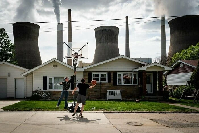 20. Дети играют в баскетбол возле угольной электростанции имени Джона Э. Амоса в Поке, Западная Вирджиния