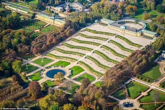 Дворец был построен в 1745-47 годах для Фридриха Великого в качестве его летней резиденции. Одна из уникальных особенностей Сан-Суси - террасный виноградник на южном склоне хребта Борнштедтер, шесть уровней которого соединены 132 ступенями.