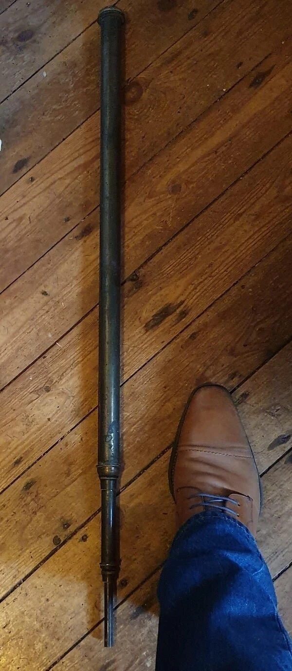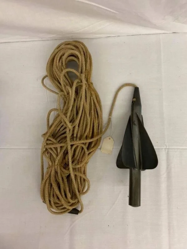 "Длинная толстая веревка с металлическим цилиндром с плавниками, которая, кажется, предназначена для вращения?"