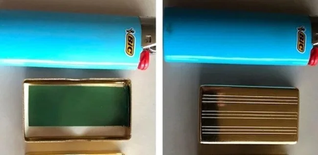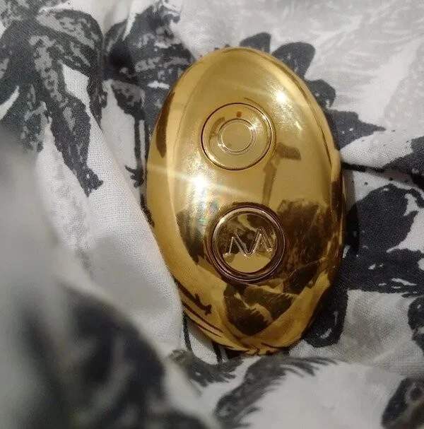 "Маленький золотой овал с двумя кнопками. Из пластика"