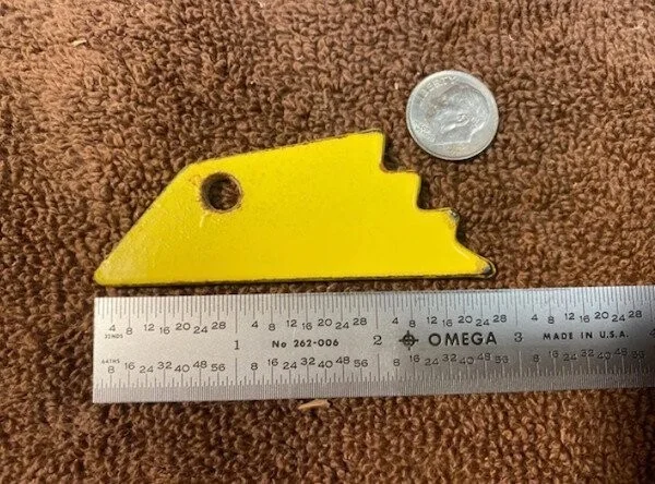 "Тяжелый предмет из черного металла, окрашенный в желтый цвет, с единственным отверстием необычной формы. Почти 10 сантиметров в длину. Нашел прикопанным на заднем дворе с помощью металлоискателя"