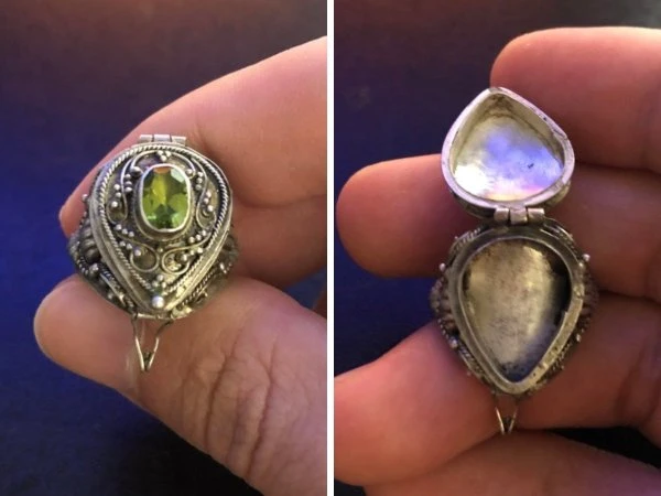 Ответ: это кольцо для твёрдых духов. Раньше на улицах было больше всего тухлого, поэтому дамы подносили такое кольцо к носу, когда проходили мимо плохо пахнущих мест.
