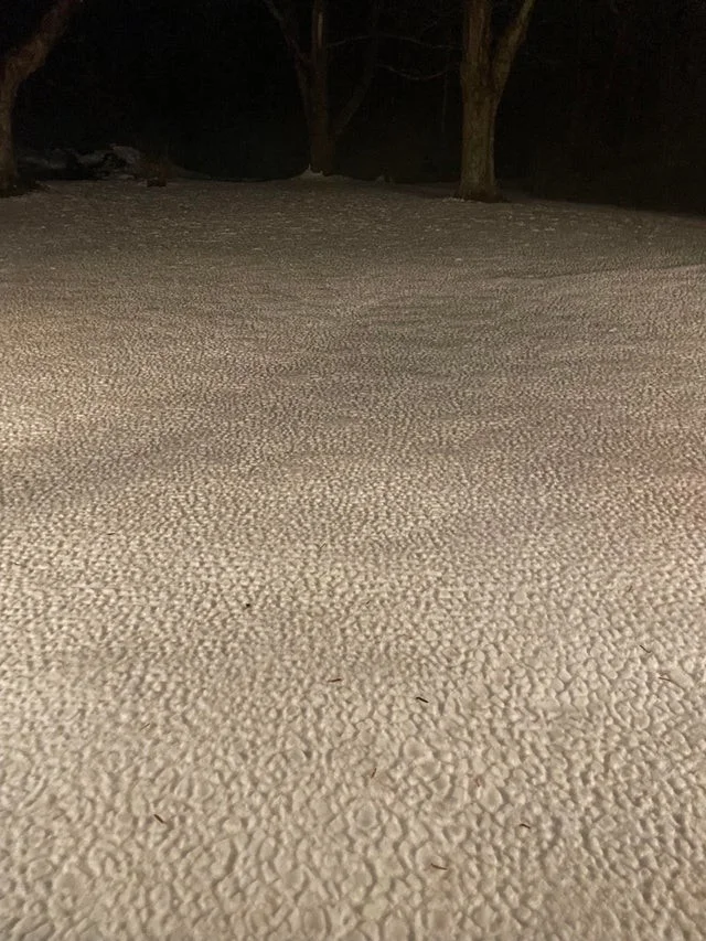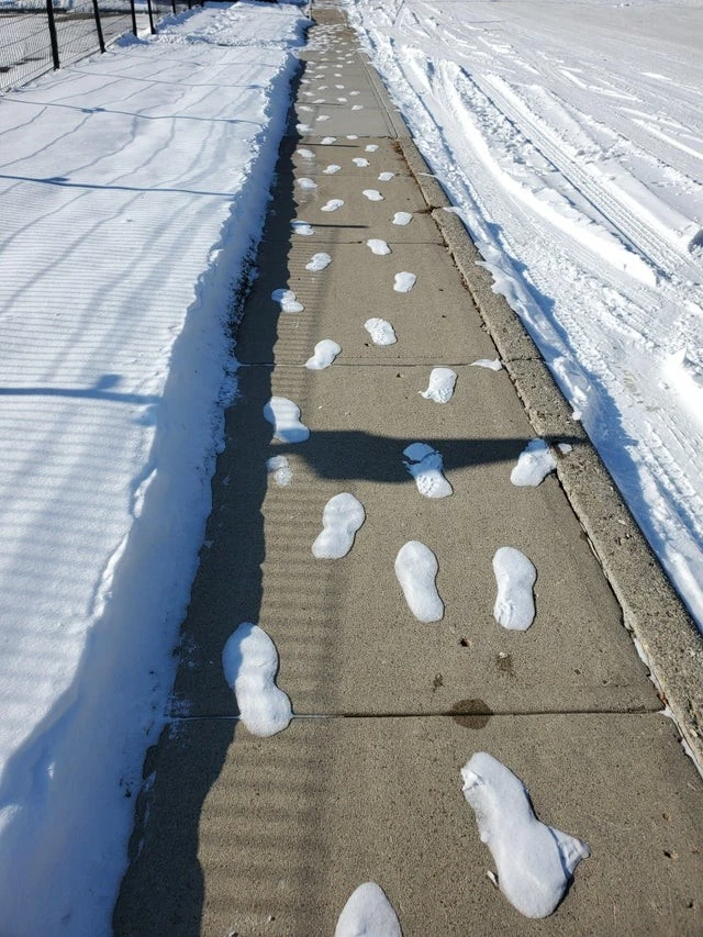 Когда на снег наступают, он немного уплотняется, слегка подтаивает, а потом снова застывает. Когда остальная часть снега тает, следы ещё остаются. Либо остальной снег просто смахнули.
