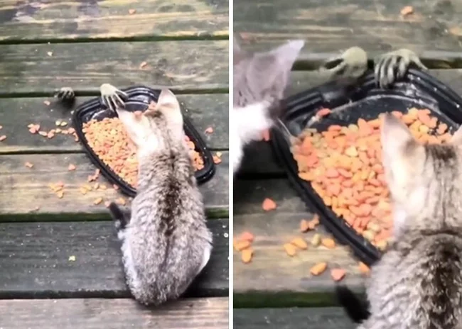 Еноты воруют еду у котенка. Жутковатые лапки!