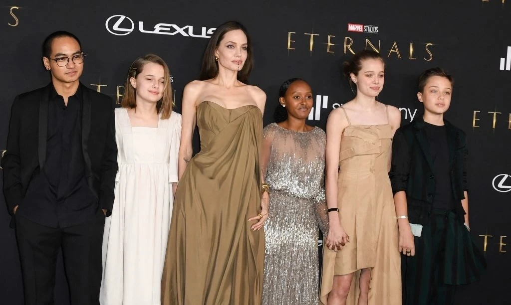 8. Анджелина Джоли со своими детьми, Мэддоксом, Вивьен, Захарой, Шайло и Ноксом на примере "Вечных" в 2021 году