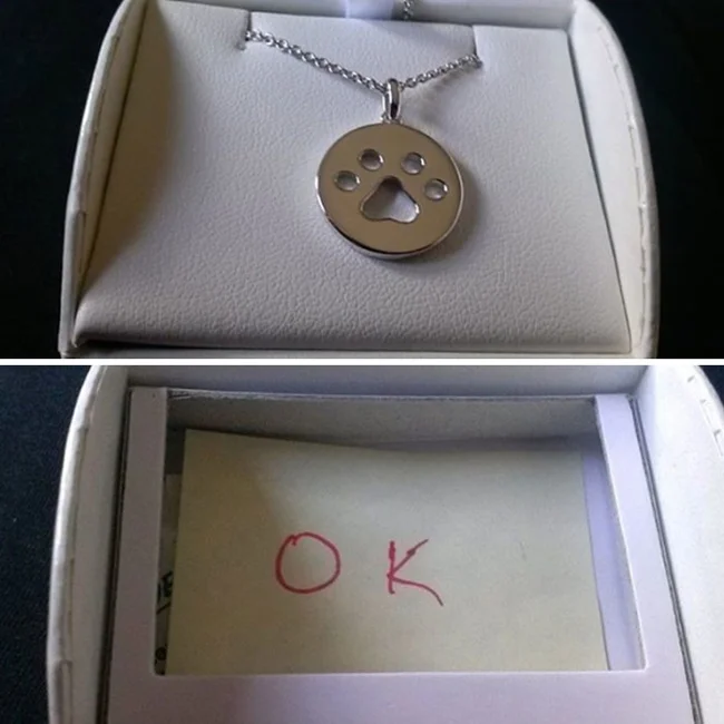 17. "Мама выпрашивала у папы собаку с тех пор, как наша умерла в мае. Рождественским утром он сделал ей сюрприз, подарив это. Он человек немногословный"